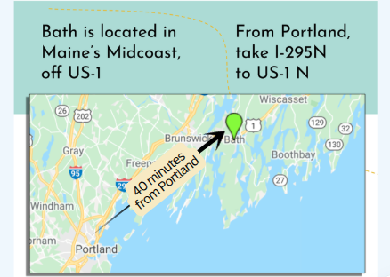 Location Only 40 minutes north of Portland, right off Route 1, with a visit to Bath you are maximizing your guests’ precious vacation time by minimizing travel. Bath can also be your gateway to other places downeast on Route 1, like Boothbay (35 minutes), Camden/Rockland (1 hour) or Bar Harbor (3 hours).